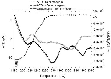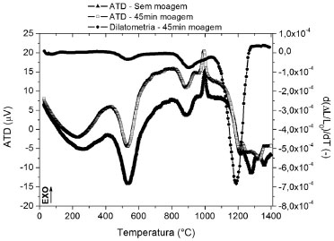 ![]() Figura 2. Resultados de ATD da formulaçao in natura e curvas de ATD e dilatometria após 45 min de moagem