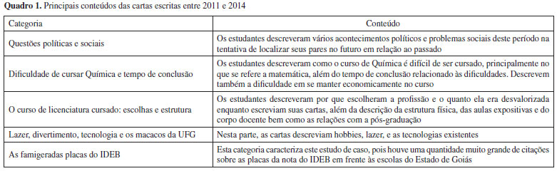 PROCEDIMENTO METODOLÓGICO Desenvolvimento da atividade A atividade foi dividida em três partes distintas. A primeira delas ocorreu entre os anos de 2011 e 2014 e a denominaremos de Parte 1. A segunda atividade ocorreu nos anos de 2023 e 2024 e a denominaremos de Parte 2. A terceira parte foi realizada também em 2023 e 2024 e a denominaremos de Parte 3. Parte 1 Esta atividade ocorreu entre os anos de 2011 e 2014. Ela foi uma das atividades de duas disciplinas, a saber, Didática e Instrumentação para o Ensino de Química do curso de licenciatura em Química da Universidade Federal de Goiás (UFG). Os estudantes de licenciatura destas turmas foram convidados a escrever uma carta para seus pares. Eles foram informados que suas cartas seriam abertas por outros estudantes do curso de licenciatura, que estivessem cursando a mesma disciplina, porém, nos anos de 2023 e 2024. Ou seja, no mínimo dali a 10 anos. Não havia uma regra específica, mas apenas pequenos direcionamentos. Era interessante que falassem sobre o curso de licenciatura que estavam cursando, o que esperavam da profissão de professores, o que esperavam do futuro, como estavam no presente, alguns acontecimentos históricos entre outros aspectos que se sentissem à vontade. O professor orientador da atividade não teve acesso ao conteúdo das cartas, pois teria contato com este juntamente com os discentes do futuro. Tal aspecto pode ter dificultado a validação das cartas como instrumento de coleta de dados, mas a ideia era não ser influenciado com a leitura das cartas quando abertas, no futuro e ter também, o mesmo nível de surpresa dos estudantes do futuro. A atividade durou cerca de 200 minutos. As cartas foram colocadas em um envelope individualmente. Todas foram colocadas em um grande envelope maior, novamente lacradas e arquivadas pelo professor regente em um armário específico. Participaram no total, 47 discentes de todas as turmas descritas nos anos de 2011 e 2014. Foram 25 discentes do sexo masculino e 22 do sexo feminino. A média de idade foi de aproximadamente 22 anos. Quando da abertura, suas cartas foram numeradas de 1 a 47 (Carta A1, Carta A2, etc.). Parte 2 Esta atividade ocorreu no segundo semestre do ano de 2023 e no primeiro e segundo semestres de 2024 nas disciplinas de Didática, diurna e noturna. Cada estudante de licenciatura foi convidado a abrir duas das cartas lacradas na Parte 1. Após abrirem, eles deveriam ler em voz alta para que todos os outros discentes pudessem compartilhar as informações (e o professor orientador da atividade no passado, que como sabem, também estava curioso). Todas as cartas foram lidas e várias discussões sobre seus conteúdos foram realizadas pelos estudantes em um clima de alegria, ansiedade, divertimento e preocupação. Participaram da atividade, 27 discentes das disciplinas dos dois semestres descritos e a atividade teve a duração de 200 minutos. Dos 27 discentes, 17 eram do sexo feminino e 10 do sexo masculino. Esses discentes foram numerados de 1 a 27 (Marty 1, Marty 2, etc., em referência a Marty Mcfly, personagem do filme De Volta Para o Futuro). Parte 3 Esta atividade ocorreu nas aulas seguintes àquelas ocorridas na Parte 2. Os estudantes que abriram a carta foram convidados a entrar em contato com os autores das cartas, para conversarem entre si e trocarem uma série de informações e experiências que considerassem interessantes de serem realizadas. Houve auxílio do professor orientador da atividade, para que os estudantes procurassem os estudantes do passado, utilizando redes sociais, e-mails e telefones. O professor orientador sugeriu um roteiro de diálogo que poderia ser utilizado pelos estudantes do presente, para os estudantes do passado. O roteiro utilizado tinha os seguintes direcionamentos: (i) Você continua na docência?; (ii) Se houve mudança, o que o levou a abandonar a docência?; (iii) Se continua na docência, quais os desafios que enfrenta ou que prevê que podem vir a acontecer?; (iv) O que você esperava em 2011-2014 em relação ao tempo presente que se confirmou ou não?; (v) O que você falaria para si 10 anos atrás?; (vi) O que você falaria para mim, licenciando em 2023/2024? Os estudantes do passado contactados foram numerados de 1 a 25 (Picard 1, Picard 2, etc., em referência ao capitão Picard da Star Trek, atuante no futuro da Série Star Trek). Caracterização do método Esta é uma proposta qualitativa do tipo estudo de caso que, segundo Morgado,18 apresenta três dimensões: exploratória, descritiva e interpretativa. Esta proposta é exploratória, pois busca entender um fenômeno desde seu início, construindo-o e reconstruindo-o a partir de todos os seus nuances. O início foi a escrita das cartas, entre 2011 e 2014. Estas cartas foram instrumentos de coleta de dados, utilizadas pelo autor para, por meio de uma categorização de temas, discutir seu conteúdo. É descritivo porque está direcionado a descrever todo um processo e seus dados obtidos, da forma mais detalhada que for possível. E é interpretativo na medida em que o investigador busca compreender todo o contexto, todos os fenômenos e o que eles podem vir a significar. O caso específico a ser utilizado é a "troca" de cartas entre estudantes de um curso de licenciatura dos anos de 2011-2014 com outros estudantes que também cursavam licenciatura nos anos de 2023/2024. Trata-se de um estudo de caso único, considerando-se que este tipo de prática pode ter resultados diferentes em diversos contextos ou formações.12 Outro aspecto que caracteriza essa proposta como um estudo de caso é seu delineamento no tempo, desde as escritas das cartas, até a troca das experiências no futuro e a análise desse fenômeno, que tem um fim e que pode, de alguma forma, generalizar resultados para outros contextos, mesmo que diferentes. Para a coleta de dados utilizamos a observação participante. Para Morgado,18 neste caso, o pesquisador é o próprio inst
