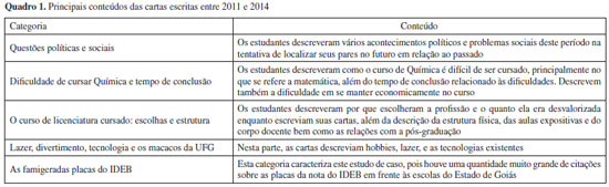 O QUE LEMOS E OUVIMOS DO PASSADO As cartas foram lidas pelos estudantes das turmas de 2023/2024 em dois períodos, noturno e diurno, em uma disciplina de Didática. Foram 47 cartas lidas por 17 estudantes. Cada estudante leu entre duas e três cartas. No passado, houve 65 estudantes distribuídos em 4 disciplinas durante 4 períodos letivos. No presente, 27 estudantes distribuídos em duas disciplinas em dois períodos letivos. Em um primeiro momento, antes de analisarmos as cartas, observamos que nesta diferença de 10 anos, houve uma redução de mais de 50% no número de estudantes por disciplina em média, confirmando o aumento da evasão nos cursos de licenciatura presenciais e dos cursos de licenciatura EAD.13 O teor das cartas do passado Após a leitura realizada pelos estudantes de 2023/2024, o pesquisador recolheu as cartas, releu todas elas e realizou uma categorização dos principais conteúdos abordados pelos estudantes. Uma síntese de cada uma das categorias propostas para a análise está apresentada no Quadro 1. A seguir, discutiremos cada uma das categorias elaboradas a partir das cartas lidas e relidas pelo pesquisador, na perspectiva de caracterizar o teor destas cartas. Não é possível compreender estas categorias como a posteriori, considerando-se que houve certo direcionamento do professor/pesquisador à época, sobre o que poderia de alguma forma estar presente. Observamos que na realidade há um misto de categorias a priori e posteriori, não claramente explicitadas. Questões políticas e sociais Nas cartas, uma parte considerável dos estudantes descreveu a situação política e econômica em que viviam neste período, tanto em nível nacional quanto em nível estadual/municipal. Muitas das falas se referiam ao fato do Brasil ter eleito a primeira presidenta em sua história. As falas a seguir são representativas deste aspecto: