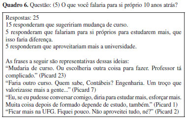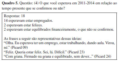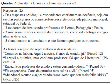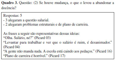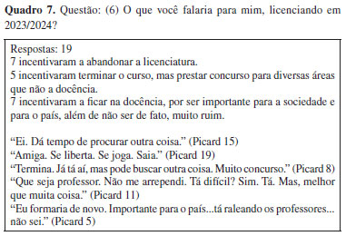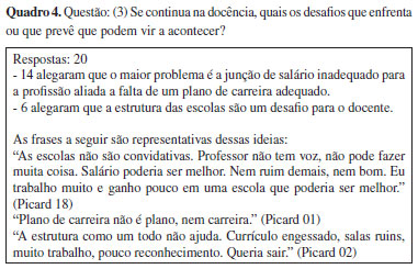 Os professores entrevistados reclamam com razão das condições de trabalho. Há carências enormes que levam ao abandono da profissão, ou desânimo para aqueles que ficam. Aspectos apontados por eles já são de discussão comum no país há um bom tempo, que vai desde ausência de uma perspectiva de contexto social e cultural apropriado, passando por uma reflexão sobre o currículo que temos nos nossos cursos de licenciatura, até a insistente falta de uma carreira atrativa com condições de trabalho minimamente adequadas. As três últimas questões aos escritores das cartas, e as respostas obtidas estão apresentadas nos Quadros 5, 6 e 7.