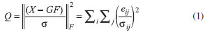 O instrumento utilizado para coleta de material particulado foi o chamado "amostrador de particulado fino e grosso" (AFG).22 Aerossóis foram coletados em dois filtros de policarbonato de 47 mm em sequência, em que o primeiro coletou partículas na moda grossa, com diâmetro aerodinâmico entre 2,5 e 10 µm e o segundo coletou partículas menores que 2,5 µm. O fluxo utilizado foi de 17 l min-1 e o tempo de amostragem variou de 1 dia na estação seca até 10 dias na estação chuvosa. Nos nove meses de amostragem na Rebio Cuieiras foram coletados 109 filtros, posteriormente analisados para a determinação da concentração de massa do material particulado na atmosfera por medida gravimétrica. O procedimento consiste na determinação da massa do filtro antes e depois da amostragem usando uma balança microanalítica eletrônica de precisão nominal 1µg em ambiente controlado com temperatura de 20 ºC e umidade relativa de 50%. A concentração de "black carbon" (BC) foi determinada por análise de refletância ótica. O instrumento, que usa luz branca difusa e um detector com um pico de eficiência por volta de 550 nm, foi calibrado com amostras padrão de BC. Elementos traços foram medidos pelo método PIXE (do inglês Particle Induced X-ray Emission)23 a partir de um feixe de prótons de energia 2,4 Mev gerado por um acelerador de partículas. O método quantifica a concentração de 20 elementos com número atômico acima do Na no material depositado nos filtros. A identificação das fontes de partículas de aerossóis foi obtida por meio do uso de modelos estatísticos multivariados: análise de fatores principais absoluta (AFPA) e fatorização de matriz positiva (FMP).24 Por meio destes modelos, é possível obter a estrutura de fontes de aerossóis a partir de medidas da composição elementar. A análise de fatores principais (AFP) é um modelo receptor que deriva a estrutura de fontes de aerossóis a partir da variabilidade das concentrações elementares. Matematicamente, a AFP é um problema de autovalores e autovetores da matriz de correlação das concentrações elementares medidas. Os fatores principais são os autovetores que foram construídos a partir da diagonalização da matriz de correlação. As variáveis que possuem a variabilidade temporal similar indicam fontes comuns ou processos de formação ou transporte similares. Para a avaliação do impacto no receptor em números absolutos se faz necessário a aplicação da análise de fatores principais absoluta (AFPA). A AFPA é uma metodologia que permite determinar o perfil e a contribuição absolutos associados a uma determinada componente principal retida. É identificado o número de fontes relevantes às emissões de partículas de aerossóis de uma determinada base de dados, extraindo-se a composição elementar média e quantificando o impacto de cada fonte discriminada. A AFPA fornece como resultado fatores com a composição elementar absoluta e seu impacto quantitativo na atmosfera.24 A análise de fatores principais absoluta foi realizada utilizando o programa de pacote estatístico SPSS 17.0. A fatorização de matriz positiva (FMP) é uma técnica estatística similar à AFPA, mas que impõe um vínculo adicional de que as contribuições das fontes devem ser positivas.25 A FMP leva em conta não só as medidas individuais, mas também os erros experimentais.26 O problema da análise de fatores é minimizar Q com respeito a G e F com a obrigatoriedade de que todos os elementos de G e F são não negativos. Q é a soma dos quadrados da razão entre o ajuste residual "e" e a estimativa de erros de cada ponto de dado "σ". Onde,