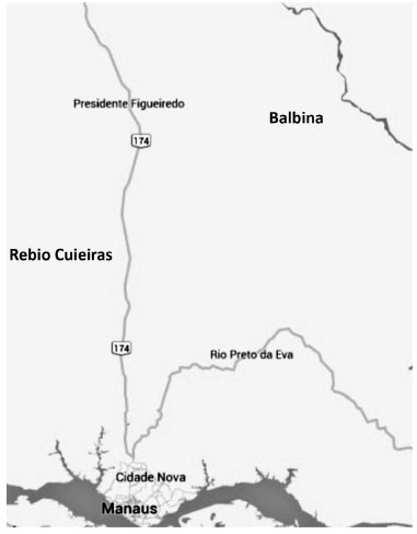 ![]() Figura 1. Figura com a localização das estações de amostragem dos aerossóis utilizadas neste estudo. Destacadas em negrito as áreas de coleta deste trabalho (Rebio Cuieiras) e (Balbina). Fonte: Adaptado (http://maps.google.com)