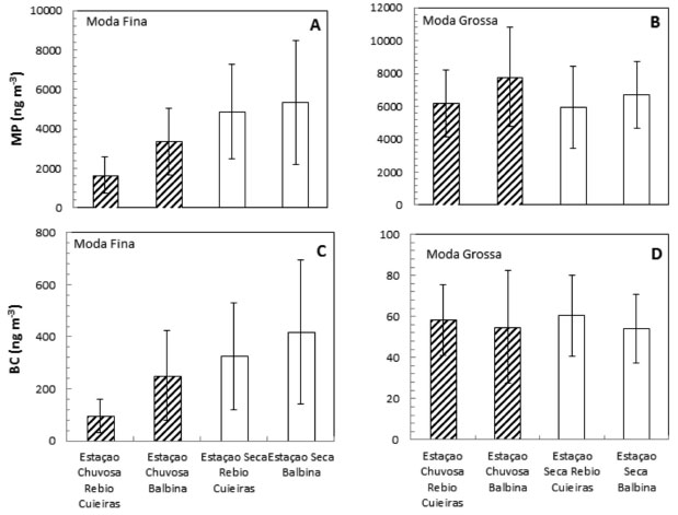 Figura 2. Comparação da concentração média do material particulado (A e B) e Black carbon (C e D) entre Rebio Cuieiras e Balbina, para as modas fina e grossa durante as estações chuvosa e seca. As barras de erros representam o desvio padrão da distribuição dos valores. Dados de Balbina são de Pauliquevis et al. 2012