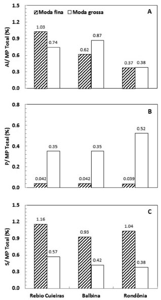 ![]() Figura 4. Comparação em porcentagem da razão entre alguns elementos químicos, Al (A), P (B) e S (C), com a massa de material particulado total durante a estação chuvosa na Rebio Cuieiras, Balbina e Rondônia