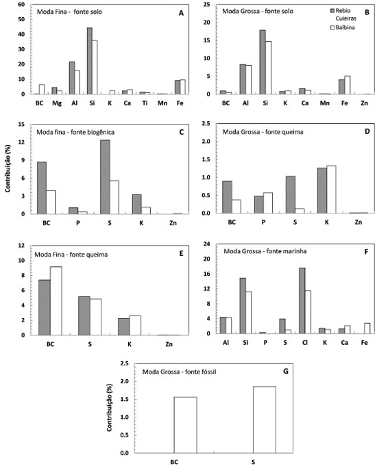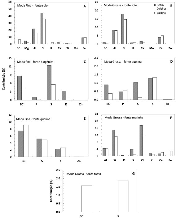 Os fatores foram ordenados de forma semelhante, seguindo com a primeira componente associada à poeira do solo com elementos pertencentes a ambos os sítios de amostragem, como por exemplo, Al, Fe, Si e Ca. A segunda componente é formada pelos elementos comuns P e K que estão associados à emissão biogênica. Para o sítio de Balbina uma terceira componente foi formada pelo modelo receptor para explicar os elementos BC e S, denominada de queima de combustível fóssil, pela presença do elemento S. Há outro fator formado por BC associado com o P, denominado Queima, por causa de pequena influência de queima de biomassa devido ao transporte atmosférico característico da região. Entretanto, comparando a segunda componente da moda grossa da Rebio Cuieiras (Tabela 2) com a segunda e terceira componentes de Balbina (Tabela 3) na mesma moda, são obtidos os mesmos elementos presentes em ambos os sítios. A quarta componente indica um possível transporte de longa distância, apresentando o elemento Cl isolado dos outros elementos. Como resultado da aplicação da análise de fatores principais absoluta, foi encontrada a assinatura do perfil elementar na Rebio Cuieiras e Balbina (Figura 5). Na moda fina, a contribuição do BC para Rebio Cuieiras foi de (0,13 %, 8,7 % e 7,4 %) nas fontes (solo, biogênico, queima), seguindo as Figuras 5A, 5C e 5E, respectivamente. Em Balbina, a AFPA apresentou (9,2 %, 6,3 %, 4 %) nas fontes (queima, solo e biogênico). E mesmo com alguma influência de queimadas de regiões circunvizinhas, a região permanece caracterizada como uma área com poucos impactos antrópicos, ao contrário da região do arco do desmatamento na Amazônia Legal. Os elementos que contribuem para a fonte solo são Al, Si, Fe, Mn e Ti na Rebio Cuieiras e Balbina (Figura 5A). A contribuição significativa dos elementos para a fonte biogênica segue com o elemento P e K para Rebio Cuieiras e Balbina (Figura 5C). A contribuição do Zn apresenta-se subdividida na Rebio Cuieiras nas fontes biogênica e queima na moda fina (Figura 5C, 5E), em Balbina na moda grossa nas fontes solo, queima (Figura 5B, 5C), mas com valor percentual significativo na fonte queima da moda grossa, pois durante a estação seca pode ocorrer uma pequena influência de queimadas na região.