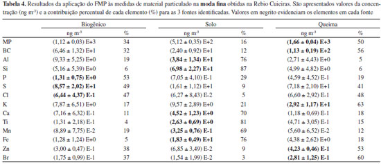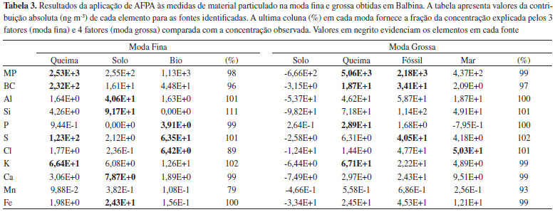 Resultados da análise de fatores principais absoluta - AFPA As bases de dados contendo as medidas das propriedades químicas do material particulado da Rebio Cuieiras e Balbina foram submetidas à análise de fatores principais absoluta. A moda fina na Rebio Cuieiras (Tabela 2) e Balbina (Tabela 3) é composta por três fatores principais, sendo a primeira componente relativa à emissão biogênica com elementos em comum para ambos os sítios, K, S e Zn, com o BC indicando emissão de queimada, que acontece no período de seca na Amazônia (agosto a outubro). Esses elementos são carregados simultaneamente com as plumas de queimadas na região, fazendo com que a floresta receba de regiões circunvizinhas elementos importantes para a ciclagem de nutrientes na Amazônia. A segunda componente refere-se à poeira do solo, com elementos comuns, como Al, Si, Fe e Ca, para moda fina tanto para Rebio Cuieiras como para Balbina. A terceira componente é composta apenas pelo elemento P, traçador importante para caracterização de emissão biogênica de aerossóis.