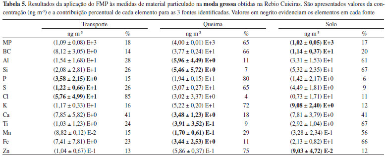 Na moda grossa, para os sítios da Rebio Cuieiras e Balbina na fonte solo, há grande semelhança na contribuição dos elementos Al (8,3 e 8,1%), Si (17,8 e 14,8%), Mn (0,07 e 0,07%) e Fe (4 e 5%), respectivamente, demonstrando a composição homogênea similar entre os sítios de amostragem. O elemento BC contribuiu com (0,96% e 0,90%) na fonte solo e biogênica na Rebio Cuieiras (Figura 5B, 5D) e para Balbina na fonte queimada (Figura 5D) com (1,6%), lembrando-se dos focos de queimadas em maior número para o sitio de Balbina durante o período de coleta de dados. Na fonte biogênica para Rebio Cuieiras e na fonte queimada em Balbina, a contribuição semelhante foi dos elementos P (0,5 e 0,6%), K (1,27 e 1,33%) e o elemento Zn contribuiu com (0,014 e 0,015%). Na Rebio Cuieiras, o elemento S contribuiu nas fontes biogênica (1,03%) e marinha (3,94%), assim como, em Balbina nas fontes queimada (1,86%) e marinha (0,96%). Talvez a presença do S na fonte marinha se deve ao fato de que o dimetil sulfeto biogênico liberado pelo oceano se transforma em sulfato ao longo do transporte atmosférico até Rebio Cuieiras, evidenciando assim a sua presença na fonte marinha. Da mesma forma, os elementos associados com outras fontes apresentaram-se significativos em suas contribuições para a fonte marinha na Rebio Cuieiras e Balbina. Uma possível explicação da presença desses elementos em uma fonte relacionada com transporte marinho é o fato de que ocorre o transporte de massas de ar que carregam consigo esses elementos a distâncias transcontinentais15 e se misturam com o ar carregado de elementos emitidos pela vegetação e elementos traçadores de emissão de poeira do deserto do Saara, por exemplo. Esse transporte foi analisado por meio das retrotrajetórias de massas de ar utilizando o modelo Hysplit. Resultados da fatorização de matriz positiva - FMP A análise por FMP complementa as análises de AFPA, pois o modelo processa apenas valores positivos de concentração atmosférica, assim podemos tirar mais informações da base de dados. As vantagens intrínsecas ao FMP não excluem, no entanto, a necessidade da análise por AFPA. A série temporal da Rebio Cuieiras 2008 foi analisada e 4% das amostras foram retiradas por apresentarem valores extremos (picos com concentrações muito elevadas), os quais o FMP não modela muito bem.28 Para os dados faltantes, o valor da mediana das concentrações medidas para cada elemento substituiu as concentrações faltantes e a incerteza da medida associada foi de 3 vezes o valor da mediana. É aplicado o ajuste dos mínimos quadrados e a relação entre Qteórico e Qatual (Qteórico > 0.70 Qatual) deve ser seguida no FMP,32 expressando que a base de dados foi modelada com o número adequado de fatores. Utilizando-se a base de dados da moda fina, o valor de o Qatual foi 0.73*Qteórico, considerado satisfatório. Na moda grossa o Qatual foi 0.93*Qteórico. Incerteza extra de 20% foi adicionada no processo antes de processar o modelo FMP. As rotações induzidas pelo Fpeak são rotações aproximadas, as quais mudam o valor do ajuste Q. Consequentemente, a menor diferença (dQ) entre QRobusto e QVerdadeiro deve ser considerada. QRobusto representa o ajuste realizado para todos os dados e QVerdadeiro, o ajuste sem valores atípicos. O Fpeak de 0.1 foi utilizado para as modas fina e grossa. Os fatores encontrados pelo FMP para a moda grossa (Tabela 5) foram os mesmos encontrados na aplicação da AFPA: (1) Transporte, elemento Cl; (2) Biogênico+BC, com CPM, BC, P, S, K e Zn; (3) Solo, com os elementos Al, Si, Ca, ti, Mn e Fe. Na moda fina (Tabela 4), os fatores discriminados foram: componente biogênica, caracterizada pelos elementos P, S e Cl. A segunda componente constitui-se em partículas originadas de solo, com os elementos Al, Si, Ca, Ti, Mn e Fe. A última componente caracteriza-se por aerossóis biogênicos com contribuições de BC, com os elementos mais marcantes BC, P, S, Cl e K.