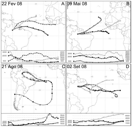 Figura 6. Gráficos de retrotrajetórias de massas de ar utilizando o modelo Hysplit para os meses de fevereiro (A) e maio (B), durante a estação chuvosa, agosto (C) e setembro (D) de 2008 na estação seca na Amazônia. As altitudes de início, sobre a Rebio Cuieiras, estão em 500 m (), 2000 m () 3000 m (). O tempo de integração foi de 10 dias