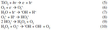 O reagente de Fenton foi e continua sendo bastante empregado na remoção de cor de efluentes das indústrias têxtil, de couro e de papel. Na última década, o processo foto-Fenton tem se mostrado uma alternativa eficiente no processo de degradação de contaminantes emergentes.120 A eficácia dos processos Fenton e foto-Fenton depende das concentrações dos reagentes e da faixa do pH da solução, que deve estar entre 2,5 e 4.121 Caso o pH seja inferior a 2, haverá uma diminuição dos •OH disponíveis no meio devido ao sequestro dos radicais formados, pelo H+. Em pH acima de 4, o processo foto-Fenton pode sofrer perda de eficácia devido à precipitação de complexos de ferro, inibindo assim a foto-redução do Fe(III). Estudos têm reportado que o melhor pH para o processo foto-Fenton é 2,8, não somente por evitar a precipitação do ferro, mas também porque as espécies ferrosas predominantes na solução são FeOH2+ (48%), Fe(III) (46,9%) e Fe(OH)2 (5%). Salienta-se que o complexo FeOH2+ é o mais foto-reativo.122 A radiação solar, quando comparada com a radiação emitida por lâmpadas ultravioletas artificiais, tem demonstrado ser a mais eficiente para o processo foto-Fenton,93 devido ao fato de ser mais apropriada para a foto-reducão do Fe(III) para Fe(II). Isso ocorre porque os comprimentos de onda emitidos pela luz solar são capazes de superar o efeito de filme interno gerado pelos complexos de ferro, dispersando a radiação pela solução e melhorando a fotólise dos complexos de ferro.123 Além disso, nem toda a radiação emitida pela maioria das lâmpadas ultravioletas artificiais é absorvida pelos complexos de ferro, gerando desperdício de energia e elevando o custo do processo.123 A fonte de Fe(II) comumente utilizada na literatura é o FeSO4.7H2O.79,93,98,103,105,107,120 A proporção entre Fe(II) e H2O2 para atingir a eficiência máxima deve ser avaliada, uma vez que essa relação varia de acordo com o composto a ser degradado e a matriz em que o mesmo se encontra. A eficácia dos processos Fenton e foto-Fenton no tratamento de um esgoto sintético contendo 15 contaminantes emergentes, incluindo flumequina e ofloxacina, foi avaliada em um reator solar em escala piloto por Klamerth et al.105 Os pesquisadores observaram que a adição de 5 mg L-1 de Fe(II) e 50 mg L-1 de H2O2 resultou na redução máxima de 45% da concentração inicial de flumequina (0,1 mg L-1). Com a introdução da radiação solar no processo, a degradação da flumequina atingiu 100% após 60 min de reação, devido à regeneração de Fe(II), conforme mostrado na Equação 4. Devido ao rápido consumo de H2O2, doses extras de peróxido de hidrogênio (50 mg L-1) foram adicionadas periodicamente para manter o reagente disponível no processo. É importante salientar que a aplicação desse POA resultou em um aumento da toxicidade nos primeiros 30 min de ensaio, quando utilizada a bactéria V. fischeri como organismo teste. Klamerth et al.79 avaliaram a degradação de um efluente de ETE por Fenton e foto-Fenton modificado e constataram que, independentemente do tempo de reação para a total degradação dos poluentes, as reações com Fenton podem ser aprimoradas pela adição de oxalato de ferro e substâncias húmicas, com a vantagem da possibilidade de utilização do pH natural do efluente, ou seja, pH em torno de 7. Rodrigues-Silva et al.107 avaliaram a eficácia dos processos Fenton e foto-Fenton para a degradação de flumequina (0,5 mg L-1) em solução aquosa. Mesmo que a degradação máxima observada tenha sido de 94% (CFe(II) = 14 mg L-1, CH2O2 = 340 mg L-1 e UV254nm = 5,68 J cm-2), verificaram que a toxicidade da solução para V. fischeri não foi alterada após o processo foto-Fenton e que a atividade antimicrobiana da solução foi totalmente removida. Os pesquisadores concluíram também que os excessos de Fe(II) e/ou H2O2 resultam na perda de eficiência do processo Fenton e foto-Fenton. De acordo com Sirtori et al.,93,103 as fluoroquinolonas ácido nalidíxico e flumequina presentes em soluções aquosas podem ser degradadas por foto-Fenton; porém, a complexidade das matrizes (como efluentes industriais), a salinidade das amostras e a elevada concentração de cloro presente nos efluentes podem alterar a cinética de degradação. UV/TiO2 A fotocatálise envolve o emprego de semicondutores, os quais são caracterizados pela banda de valência, banda de condução e a diferença de energia entre elas, o bandgap. Dentre os fotocatalisadores, o dióxido de titânio (TiO2) destaca-se devido à sua alta foto-atividade, ou seja, capacidade do semicondutor de absorver a radiação numa ampla faixa do espectro eletromagnético, natureza não tóxica, valor de bandgap adequado para a utilização com radiação UV, elevada estabilidade química, baixo custo e dispensar o uso de reagentes coadjuvantes. A fotocatálise pode ser procedida de duas maneiras: empregando semicondutor em suspensão ou imobilizado.123,124 Para que seja gerado um elétron (e-) lacuna h+ (Equação 5), deve ser incidida uma energia suficiente para superar o bandgap do semicondutor. A absorção de fótons pelo semicondutor, com energia maior que o bandgap, resulta na promoção do elétron da camada de valência para a de condução. O bandgap do TiO2 varia conforme a sua estrutura cristalina, a qual pode ser constituída em anatase, rutilo e brookite. O semicondutor mais comumente utilizado em ensaios fotocatalíticos com quinolonas é o TiO2 P25 da Degussa,77,97,102,106 que possui uma fase cristalina constituída por 80% anatase e 20% rutilo. Essa composição confere uma área superficial de 55 m2 g-1 e um bandgap entre 3,00-3,15 eV.125 Nas Equações 5 a 10 são apresentadas as reações envolvidas durante a formação dos radicais pelo processo fotocatálitico com TiO2.123