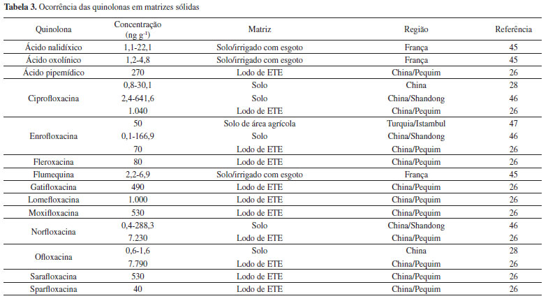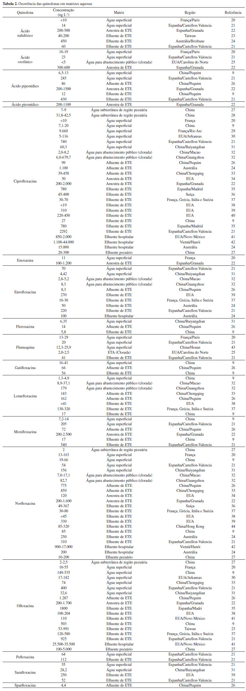Não existem dados e informações disponíveis na literatura sobre o volume de produção de medicamentos, inclusive antimicrobianos, voltados à medicina humana e veterinária no Brasil e pouco se conhece sobre o destino e efeitos desses compostos no meio ambiente. No Brasil, sabe-se apenas que a produção de medicamentos destinados à medicina humana e veterinária movimentou cerca de R$ 22,1 bilhões em 2010, sendo R$ 1,3 bilhão referente à produção e venda de antimicrobianos destinados ao consumo humano e R$ 1,5 bilhão ao uso veterinário.18 Nos Estados Unidos da América, o Animal Health Institute (AHI) apresentou uma estimativa que em 2008, dos 12 milhões de quilos de antimicrobianos produzidos, apenas 30% seria empregado para fins terapêuticos.19 Pesquisas sobre o monitoramento de quinolonas em águas superficiais são escassas na literatura especializada. Dos trabalhos publicados sobre a ocorrência e identificação de tais compostos no ambiente, apenas algumas das quinolonas existentes, apresentadas na Tabela 1, são foco dos estudos, conforme apresentado nas Tabelas 2 e 3. As principais pesquisas sobre a ocorrência de quinolonas em matrizes aquosas (água superficial, água para abastecimento público, afluente e efluente de estações de tratamento de esgoto, efluente hospitalar e efluente pecuário) foram realizadas na Europa (França, Espanha, Áustria, Holanda, Suíça, Grécia, Itália e Suécia), Ásia (China, Vietnã e Taiwan) e Estados Unidos. A concentração das quinolonas variou entre ng L-1 e µg L-1 em matrizes aquosas (Tabela 2)9,20-44 e, em solo, variou entre ng g-1 a µg g-1 (Tabela 3).26,28,45-47