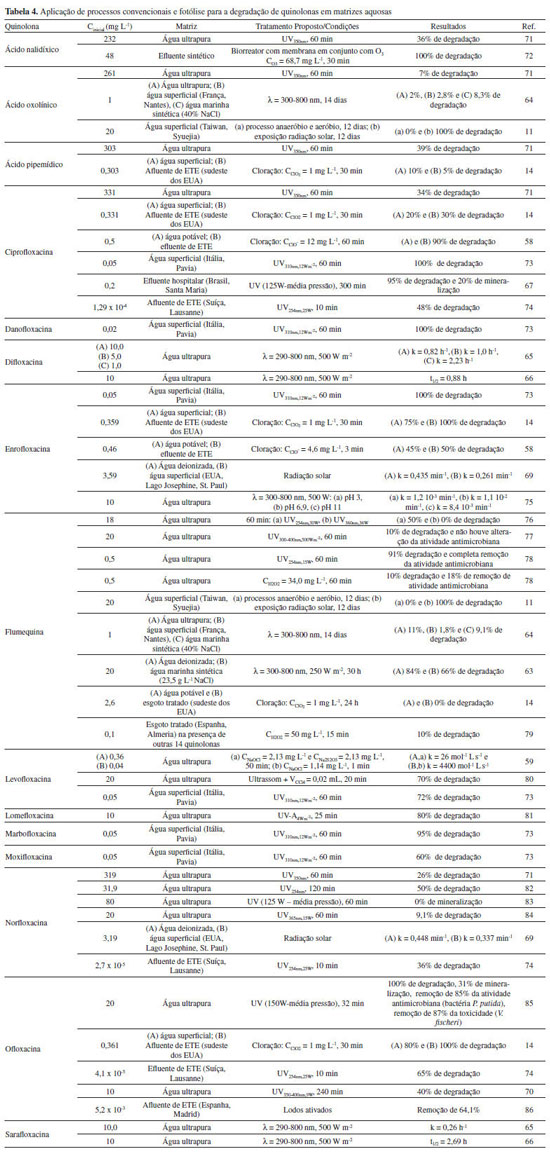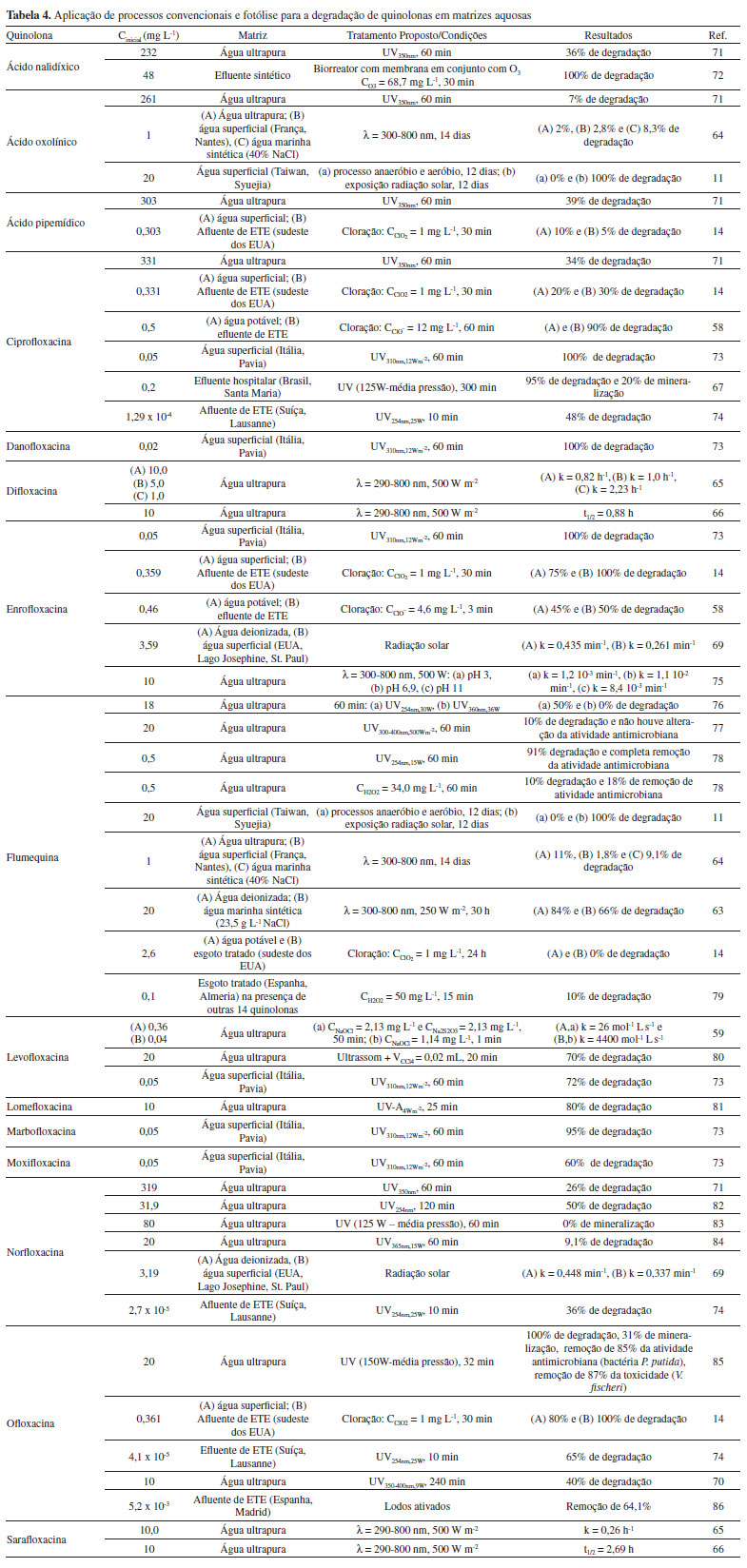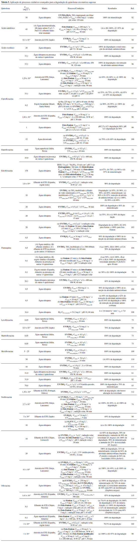 Processos oxidativos avançados Os POA podem ser definidos como processos baseados na formação do radical hidroxila (•OH), um forte oxidante não seletivo com capacidade de mineralizar compostos orgânicos, devido ao seu elevado potencial de redução (E = 2,73 V), superior ao dos oxidantes convencionais.87,88 Os radicais hidroxila se destacam frente a outros oxidantes visto a sua capacidade de inativar micro-organismos e,89 principalmente, de mineralizar compostos orgânicos recalcitrantes90,91 como, por exemplo, antimicrobianos presentes em matrizes aquosas.16 O uso da radiação solar e de lâmpadas de que emitem radiação ultravioleta tem se mostrado indicado para a degradação de quinolonas em solução aquosa quando o emprego se dá em conjunto com H2O2, O3, Fe(II) e TiO2,13,61,67,70,73,74,76-79,82,83,85,92-117 conforme apresentado na Tabela 5.