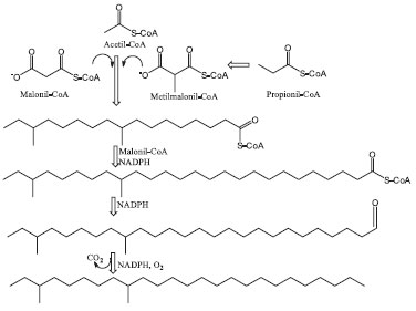 ![]() Figura 1. Rota de biosíntese proposta para cadeias de hidrocarbonetos ramificadas