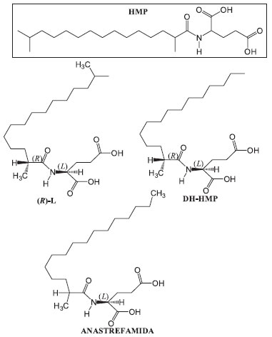 ![]() Figura 2. Estrutura dos compostos descritos como feromônio de marcação de hospedeiro com efeito arrestante para Anastrepha spp. A. ludes. HMP: ácido N-(2,14-dimetil-1-oxopentadecil)-glutâmico; (R)-L: (L)-2(R)-2-(2,15-dimetilpentadecanoilamino-pentanodióico); DM-HMP:(ácido [L]-2-[(R)-2-metil-pentadecanoilamino]-pentanodióico e; Anastrefamida: mistura diasteroisomérica 1:1 dos ácidos [L]-2-[(R)-2-metil-hexadecanoilamino]-pentanodióico e [L]-2-[(S)-2-metil-hexadecanoilamino]-pentanodióico)