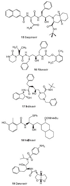 A introduçao da primeira geraçao de inibidores, os fármacos 16, 17 e 18, mudou a natureza da AIDS epidêmica de doença terminal para doença passível de tratamento.67 O darunavir (19) (Prezistar), um dos mais recentes inibidores da HIV-1 PR, foi planejado com o objetivo de maximizar as interaçoes hidrofóbicas e ligaçoes hidrogênio com os resíduos do sítio S2 da protease, pela introduçao do ligante bis-tetraidrofurano (bis-THF).68 Kovalevsky e colaboradores69 mostraram que o composto 19 possui dois sítios de ligaçao na enzima protease: um no próprio sítio ativo e outro em um dos flaps móveis do dímero. A existência deste segundo sítio de ligaçao sugere um mecanismo para a grande efetividade de 19 contra os vírus mutantes que sao resistentes aos demais fármacos da classe. Baseados no sucesso do desenvolvimento do darunavir, Ghosh e colaboradores planejaram novos peptideomiméticos do tipo ciclopentiltetraidrofurano (Cp-THF), como ligantes em P2, substituindo a estrutura bis-THF presente em 19. Os compostos desta série apresentaram valores de Ki na ordem de nM e pM.70 Apesar da existência de vários fármacos no mercado para terapia anti-HIV, que provam inequivocamente que a HIV PR consiste em um alvo terapêutico importante, a terapia anti-HIV PR torna-se limitada devido ao surgimento de cepas virais mutantes resistentes a essas drogas. Esse fato justifica a necessidade da busca constante de novas estruturas capazes de superar e inibir as mutaçoes enzimáticas.71