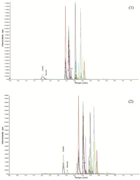 RESULTADOS E DISCUSSAO Otimizaçao do método por LC-MS/MS Condiçoes cromatográficas Dois tipos de fases móveis foram testadas durante o processo de otimizaçao do método. Inicialmente foi utilizada fase móvel que consistia em (A) soluçao aquosa acidificada com 0,1% ácido fórmico (v/v) e (B) acetonitrila 0,1% ácido fórmico (v/v). Esta fase móvel foi utilizada com o objetivo de garantir limpeza eficiente da coluna, assegurando sua vida útil. Os resultados obtidos nas análises utilizando esta fase móvel foram satisfatórios e reprodutíveis, porém, com resoluçao insatisfatória para os picos do atenolol e sotalol, além de tempo de eluiçao de aproximadamente 1 minuto para a maioria dos compostos. A segunda fase móvel utilizada consistiu em (A) soluçao aquosa acidificada com 0,1% ácido fórmico (v/v) e (B) metanol 0,1% ácido fórmico (v/v). Os resultados obtidos foram satisfatórios, reprodutíveis, com picos bem resolvidos para atenolol e sotalol, resultando em tempo de eluiçao dos analitos de aproximadamente 3 minutos (Figura 1). A utilizaçao desta fase móvel apresenta como única desvantagem eluiçao de maior quantidade de coextrativos, porém, nenhum destes coelui com os analitos. O aumento do tempo de retençao de compostos coextraídos é compatível com o comportamento de aumento de tempo de retençao dos analitos.