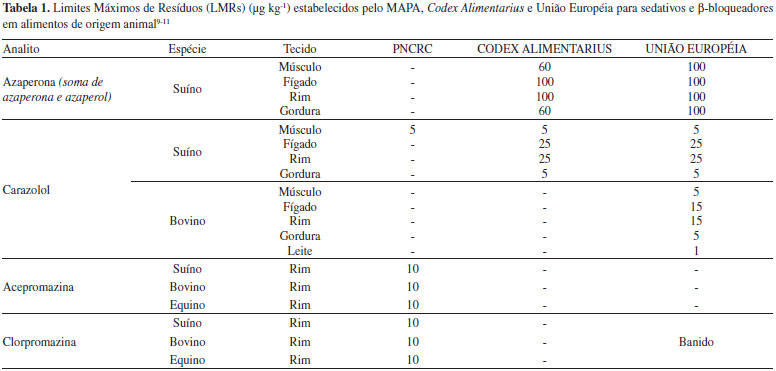 IEscola de Química e Alimentos, Universidade Federal do Rio Grande, 95500-000 Santo Antônio da Patrulha - RS, Brasil Recebido em 13/02/2014 *e-mail: leniseoliveira@furg.com A procedure was developed for determination of 5 sedatives and 14 β-blockers in swine kidney and subsequent analysis by liquid chromatography coupled to tandem mass spectrometry (LC-MS/MS). Three different procedures for extraction were tested, evaluated through recovery studies. The procedure using acetonitrile for extraction and cleanup with freezing at low temperature and dispersive solid phase extraction using 500 mg celiter 545 before the concentration step presented the better results. The dried samples were redissolved with methanol and analyzed using a LC-MS/MS system with electrospray ionization (ESI) operating in positive MRM mode. The recovery values for this procedure were in the 75-88% range. The robustness of the method was tested against small variations. The method was used to analyze carazolol, azaperone and azaperol in collaborative assay, obtaining results close to designed value. INTRODUÇAO O Brasil é destaque mundial na produçao de alimentos e, neste contexto, o setor de carnes vem crescendo gradativamente, impulsionado tanto pelo mercado interno quanto externo. Para suprir a demanda de mercado, o produtor pecuário nacional tem cada vez mais lançado mao de estratégias de manejo que primam pelo aumento do sucesso da cadeia produtiva de carne, pela melhoria do produto final e pela manutençao da saúde e bem-estar animal, conforme estabelecido nas Boas Práticas de Manejo (BPM).1 O emprego de medicamentos veterinários tem se configurado como uma prática-chave ao longo das diferentes etapas de produçao animal, pois reduz a incidência de doenças e melhora a qualidade de vida dos animais. No Brasil, as drogas veterinárias de maior emprego sao as antiparasitárias e as antimicrobianas2 devido, principalmente, ao regime de manejo (predominantemente extensivo) e às condiçoes climáticas (temperatura e umidade elevada) dos locais de produçao. No entanto, outras classes de drogas sao usadas com fins mais específicos. Este é o caso dos sedativos e β-bloqueadores. Tais compostos têm sido usados principalmente em suínos com o objetivo primário de reduzir a atividade excessiva e ansiedade dos animais durante seu transporte, além de possibilitar o aumento da taxa de conversao alimentar e reduzir o aparecimento de carnes do tipo PSE, - Pale, Soft e Exudative, que significa pálida, mole e exsudativa.3,4 Os suínos sao animais extremamente suscetíveis ao estresse durante o transporte podendo vir a óbito em decorrência de complicaçoes cardíacas.5 Assim, tanto os sedativos quanto os β-bloqueadores têm contribuído com a reduçao de perdas e a melhoria do bem-estar animal durante transporte. Entretanto, esses compostos apresentam a característica de acúmulo em tecidos, principalmente no rim e no fígado, e podem permanecer como resíduo nos alimentos caso a administraçao dos medicamentos seja feita poucas horas antes do abate.6,7 No que diz respeito aos resíduos de medicamentos veterinários em alimentos, diversos órgaos oficiais, nacionais e internacionais, determinam, por meio de suas normativas, os Limites Máximos de Resíduos (LMR) que podem estar presentes nos alimentos, considerando a ingestao diária aceitável do composto (IDA), protegendo a saúde do consumidor e garantindo a segurança do alimento oferecido para consumo humano através de programas de monitoramento.8 As normas referentes a LMRs para resíduos de medicamentos veterinários do Mercado Comum do Sul (MERCOSUL) e Food and Drug Administration (FDA) nao apresentam valores estabelecidos para sedativos e β-bloqueadores. Já o Programa Nacional de Controle de Resíduos e Contaminantes em Produtos de Origem Animal (PNCRC), do Ministério da Agricultura, Pecuária e Abastecimento (MAPA), o Codex Alimentarius e a Comunidade Europeia, por meio das suas normativas,9-11 apresentam limites para alguns compostos destas classes. Estes limites estao descritos na Tabela 1.