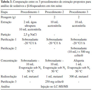 na qual AR corresponde a variaçao do analito remanescente, Ci é a concentraçao média da soluçao e Cnova é a concentraçao média da soluçao nova. Para determinaçao da estabilidade do analito em extrato, foi realizado fortificaçao em extrato obtido de amostra branca, sendo analisado no dia do preparo e 24 h após o preparo. Durante este período, elas permaneceram a uma temperatura de 20 ºC em frasco de polipropileno. Foi utilizado o mesmo cálculo descrito anteriormente, onde Cnova será a concentraçao obtida na análise realizada no dia do preparo. Amostras As amostras brancas de rim suíno foram obtidas junto a estabelecimentos sob Serviço de Inspeçao Federal (SIF) do MAPA. Foram retiradas pequenas porçoes da parte externa do órgao, já isento de cápsula fibrosa, e processadas até homogeneizaçao com auxílio de processador de amostras. A amostra foi acondicionada e mantida em freezer a -20 ºC, em recipiente plástico, para posterior utilizaçao. Otimizaçao do método por LC-MS/MS Condiçoes cromatográficas A escolha da fase móvel foi realizada inicialmente através de revisao bibliográfica. Foi utilizado (A) soluçao aquosa acidificada com 0,1% de ácido fórmico (v/v) e (B) metanol acidificado com 0,1% de ácido fórmico (v/v).25 Também foi testada a seguinte composiçao: (A) soluçao aquosa acidificada com 0,1% de ácido fórmico (v/v) e (B) acetonitrila acidificada com 0,1% de ácido fórmico (v/v). Sistema de detecçao Para otimizaçao dos parâmetros dependentes do composto, inicialmente foi realizado infusao dos compostos em solvente na concentraçao de aproximadamente 200 µg L-1 com o objetivo de selecionar no mínimo 2 fragmentos (íons produto) de maior intensidade ou seletividade para cada analito, sendo o mais intenso utilizado como íon quantificador e o segundo como qualificador. Para otimizaçao dos parâmetros dependentes da fonte de ionizaçao foram realizados os experimentos de injeçao em fluxo (Flow Injection Analysis, FIA) visando obter as melhores condiçoes para o conjunto de compostos. Desenvolvimento e otimizaçao dos procedimentos de extraçao Três métodos de extraçao foram propostos com o objetivo de verificar qual apresentaria melhor recuperaçao, além de produzir extratos com menor concentraçao possível de coextrativos para análise de sedativos e β-bloqueadores em rim suíno por LC-MS/MS. Procedimento 1 O procedimento 1 consistiu na pesagem de 5 g de amostras brancas em tubos de polipropileno com capacidade para 50 mL e fortificadas na concentraçao de 10 µg kg-1 (apenas A1, A2 e A3). Após homogeneizaçao em vórtex por 20 s, foi realizada adiçao de 2 mL de água ultrapura e 10 mL de acetonitrila. As amostras foram trituradas e homogeneizadas em ultra-turrax e, em seguida, agitadas em mesa agitadora a 180 rpm por 20 min. Após agitaçao foi adicionado 2,5 g de NaCl, seguido de nova agitaçao por 5 min nas mesmas condiçoes anteriores. As amostras foram centrifugadas a 5670 g por 5 min a 5 ºC, o sobrenadante foi transferido para tubo de polipropileno de 15 mL e acondicionado em freezer a -20 ºC por 1 h. Posteriormente, a amostra foi centrifugada a 5670 g e 0 ºC por 20 min, o sobrenadante foi transferido para tubo de polipropileno de 50 mL e evaporado até secura sob fluxo de N2 a 50 ºC. As amostras secas foram fortificadas na concentraçao de 10 µg kg-1 (apenas B1, B2 e B3) e retomadas com metanol obtendo-se volume de 1 mL, agitadas em vórtex por 20 s e transferidas para tubos eppendorf para centrifugaçao a 16200 g por 10 min a 0 ºC. Após centrifugaçao, as amostras foram transferidas para frasco com capacidade para 2 mL e analisadas por LC-MS/MS. Procedimento 2 O procedimento 2 consistiu na pesagem de 2 g de amostras brancas em tubos de polipropileno com capacidade para 50 mL e fortificadas na concentraçao de 10 µg kg-1 (apenas A1, A2 e A3). Após homogeneizaçao em vórtex por 20 s, foi adicionado 10 mL de acetonitrila. Com auxílio de ultra-turrax as amostras foram trituradas e homogeneizadas. Em seguida, foram colocadas em mesa agitadora por 20 min a 180 rpm. Após agitaçao, as amostras foram centrifugadas a 5670 g por 5 min a 5 ºC. Os sobrenadantes foram transferidos para tubo de polipropileno de 15 mL e acondicionados em freezer a -20 ºC por uma hora. Posteriormente, a amostra foi centrifugada a 5670 g por 20 min a 0 ºC. O sobrenadante foi transferido para tubo de polipropileno de 50 mL e evaporado até secura sob fluxo de N2 a 50 ºC. As amostras secas foram fortificadas na concentraçao de 10 µg kg-1 (apenas B1, B2 e B3) e retomadas com metanol obtendo-se volume de 1 mL, agitadas em vórtex por 20 s, transferidas para tubos eppendorf contendo 250 mg de celite® 545 e novamente homogeneizadas em vórtex por 20 s. Após homogeneizaçao, as amostras em tubos eppendorf foram centrifugadas a 16200 g por 20 min a 0 ºC e transferidas para frasco com capacidade para 2 mL para posterior análise por LC-MS/MS. Procedimento 3 Este procedimento consistiu na pesagem de 2 g de amostras brancas, previamente homogeneizadas, em tubos de polipropileno com capacidade para 50 mL e fortificadas na concentraçao de 10 µg kg-1 (apenas A1, A2 e A3), seguido de adiçao de 10 mL de acetonitrila. Com auxílio de ultra-turrax as amostras foram trituradas e homogeneizadas. Em seguida, foram colocadas em mesa agitadora e agitadas por 20 min a 180 rpm. Após agitaçao, as amostras foram centrifugadas a 5670 g por 5 min a 5 ºC, o sobrenadante foi transferido para tubo de polipropileno de 15 mL e acondicionado em freezer a -20 ºC por uma hora. Posteriormente, a amostra foi centrifugada a 5670 g por 20 min a 0 ºC e o sobrenadante foi transferido para novo tubo de polipropileno de 15 mL contendo 500 mg de celite® 545. As amostras foram agitadas em vórtex por 20 s e novamente submetidas a centrifugaçao a 5670 g por 20 min a 0 ºC. Uma alíquota de 1 mL foi transferida para tubo de polipropileno de 50 mL e evaporada a 50 ºC, so