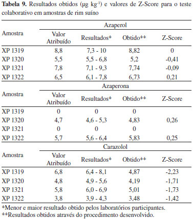 Aplicabilidade do procedimento A aplicabilidade do procedimento foi testada através de análise de amostras de rim suíno enviadas pela Canadian Food Inspection Agency para determinaçao de carazolol, azaperona e azaperol, em ensaio colaborativo. Cinco amostras foram recebidas em embalagem devidamente identificada e lacrada, sendo que uma delas consistia em branco de rim suíno, portanto isenta dos analitos, para construçao de curva de calibraçao. A estimativa da reprodutibilidade dos procedimentos utilizados pelos diferentes laboratórios é dada pela avaliaçao do Z-Score, que considera os resultados enviados por cada um dos laboratórios e os desvios padrao obtidos no ensaio colaborativo, conforme Equaçao 2.