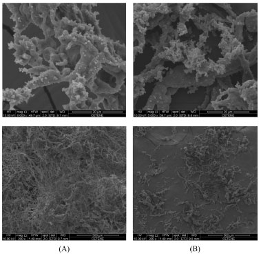 A enzima livre submetida a 40 ºC manteve sua atividade inicial (75 U/mL) após 21 horas de exposiçao. Nas temperaturas de 60 e 80 ºC, as atividades residuais foram de 1,26 e 0,33% após exposiçao de 3 horas. O estudo da estabilidade de temperatura CalB livre foi estudada por Arroyo et al.,24 onde após 1 hora de exposiçao a 50 ºC a atividade apresentou reduçao de 70%. A estabilidade da CalB livre em temperaturas elevadas também foi avaliada por Silva et al.21 Os autores verificaram que a enzima foi completamente inativada após 21 h de exposiçao a 60 ºC. O derivado imobilizado, após exposiçao de 21 horas a 40 ºC manteve sua atividade inicial. Após 21 horas de exposiçao a 60 ºC, a atividade hidrolítica da CalB/PHBV apresentou decréscimo, com atividade residual de 67%. Cabe ressaltar que Silva et al.21 utilizaram diversas preparaçoes de quitosana para imobilizar a lipase Candida antarctica B e a estabilidade térmica dos derivados imobilizados a 60 ºC por 21 horas apresentaram uma atividade residual em torno de 40 %. Na temperatura de 80 ºC a enzima imobilizada manteve mais de 50 % de sua atividade inicial. Nesse sentido, dentro do escopo deste trabalho, pode-se verificar que e metodologia de imobilizaçao proposta apresenta viabilidade técnica, tendo em vista o aumento considerável da estabilidade do derivado enzimático em comparaçao à enzima livre, quando submetida a temperaturas elevadas. O derivado enzimático demonstrou atividade residual de 50% após 30 dias de estocagem em geladeira (4 ºC). Nesta mesma temperatura, o extrato imobilizado perdeu completamente sua atividade hidrolítica após 45 dias de armazenamento. Caracterizaçao das nanopartículas de PHBV e do derivado enzimático A precipitaçao do polímero PHBV em dióxido de carbono supercrítico utilizando a técnica SEDS resultou na formaçao de nanofibras de 5 a 7 µm de largura (Figura 1 (A)) e após a imobilizaçao ocorreu um aumento na espessura das nanofibras para valores entre 7 a 10 µm (Figura 1 (B)). As micrografias demonstram existência de similaridade morfológica. As enzimas imobilizadas possuem maior tamanho de partícula, este fato está relacionado com as pequenas aglomeraçoes formadas durante a imobilizaçao.24