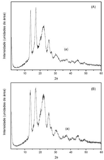 ![]() Figura 2. Difratograma de raio X das nanopartículas de PHBV (A) e do derivado imobilizado (B)