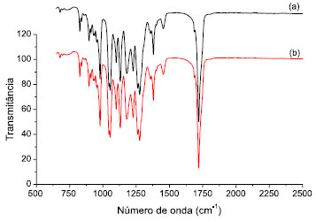 ![]() Figura 3. Espectros no infravermelho dos materiais (a) antes (b) depois da incorporaçao da enzima