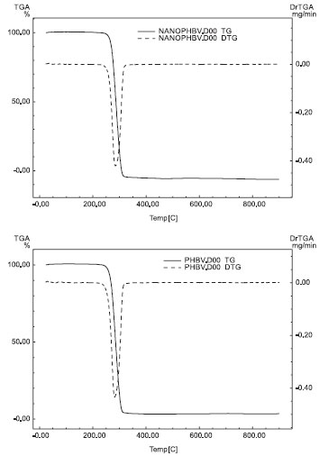 A Figura 4 apresenta os resultados da análise termogravimétrica das amostras antes e após a incorporaçao da enzima. Observa-se desta figura que os materiais possuem uma grande estabilidade térmica (~ 297 ºC) e que a esta temperatura ocorre uma degradaçao total do polímero com perda total de massa. Esta perda ocorre um uma única etapa, à temperatura de ~ 297 ºC e é associada a um evento exotérmico. Este comportamento sugere que nenhuma alteraçao nas propriedades térmicas ocorre em funçao da imobilizaçao da enzima nas nanofibras.