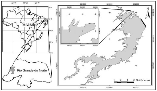 PARTE EXPERIMENTAL Area de estudo O reservatório de Santa Cruz está localizado na bacia hidrográfica do rio Apodi/Mossoró e encontra-se no município de Apodi, semiárido do Rio Grande do Norte (Figura 1). A sua área é de 3413,36 ha, com capacidade máxima de 599.712.000,00 m3. A altura máxima corresponde a 57,5 m e a área de sua bacia engloba 4.264,00 km2.15 O clima local é do tipo BSw'h', da classificaçao climática de Köppen, caracterizado por um clima muito quente e semiárido, com a estaçao chuvosa se atrasando para o outono.