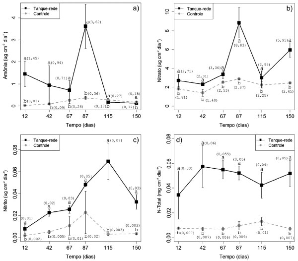 Figura 3. Taxas de sedimentaçao de a) amônia; b) nitrato; c) nitrito; d) nitrogênio total. Valores médios, onde barras verticais representam os respectivos desvios-padrao; médias entre parênteses