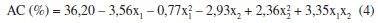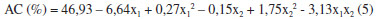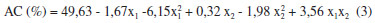 No planejamento em que foi utilizada a mistura dos solventes metil-etil-cetona e acetato de etila observou-se que porcentagem de AC extraída variou de 33,0 a 50,0%. O termo quadrático da mistura de solventes e o termo mistura de solventes x temperatura foram os parâmetros estatisticamente significativos a 5% (p < 0,05). A ANOVA (Tabela 3) apresentou uma boa porcentagem de variaçao explicada (R2) pelo modelo (91%), e o valor de 10,16 para o Fcalc é significativo, ou seja, o modelo se ajusta bem aos dados experimentais sendo possível a construçao da superfície de resposta para a análise dos resultados (Figura 3). O modelo completo com as variáveis codificadas que representa a porcentagem de extraçao de AC obtida em funçao da temperatura e da razao de solventes na faixa estudada está representado pela Equaçao 3. ![]()