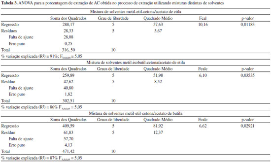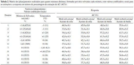 O tempo de agitaçao para contato entre as fases foi estatisticamente significativo a 5% de significância (p < 0,05), entretanto nao foi possível a utilizaçao do modelo para a construçao e análise de superfície, uma vez que na análise de variância o Fcalculado (Fcalc) encontrado, foi de 3,6, sendo inferior ao Ftabelado (Ftab) que foi de 5,5. Visto que o ensaio para o qual foi obtido o maior rendimento (34,1%) ocorreu a 90 s e 25 ºC, foi fixado o tempo de contato entre as fases em 90 s para os planejamentos seguintes. O acetato de etila foi escolhido no trabalho de Brites et al.12 como o melhor solvente a ser utilizado para a extraçao do AC presente no caldo de fermentaçao, considerando apenas o emprego de solventes individuais, para o qual foi obtido um rendimento de extraçao de 35,6 % a uma concentraçao inicial de AC de 161,9 mg L-1. Assim, o resultado encontrado neste trabalho está de acordo com o relatado por Brites et al..12 Sabe-se que o AC possui uma elevada velocidade de degradaçao a temperaturas acima de 20 ºC e, por esse motivo, nos trabalhos descritos em literatura a temperatura utilizada nos processos está abaixo de 20 ºC ou preferencialmente em torno de 10 ºC, na qual este apresenta maior estabilidade.4,20,21 Neste planejamento foi observado que o maior rendimento obtido para a extraçao do AC ocorreu para o nível +1 do planejamento, ou seja, para a temperatura ambiente (25 ºC). Portanto é possível afirmar que a utilizaçao do planejamento fatorial foi de grande utilidade, mesmo sem a análise de superfície de resposta, pois desta forma foi possível avaliar as interaçoes entre as variáveis que proporcionaram uma extraçao com elevado rendimento à temperatura ambiente, implicando em um menor gasto de energia no processo de extraçao do AC utilizando o acetato de etila como solvente. Na Tabela 2 encontram-se os resultados obtidos para os planejamentos fatoriais que avaliaram o emprego de quatro misturas distintas de solventes em diferentes temperaturas para o processo de extraçao do AC.