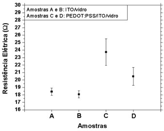 RESULTADOS E DISCUSSÃO Após a limpeza química com solventes e também com tratamento superficial dos filmes de ITO com UV-Ozônio, selecionamos duas amostras de ITO/vidro e medimos a resistência elétrica nos 18 pares de pontos diferentes estabelecidos. Este mesmo método também fizemos para duas amostras de PEDOT:PSS depositados sobre a estrutura ITO/vidro. A Figura 1 mostra a comparação entre os valores médios de resistência elétrica dos filmes de ITO/vidro e PEDOT:PSS/ITO/vidro com seus respectivos desvios padrões, sendo que as amostras analisadas com ITO/vidro foram nomeadas pelas letras A e B e as amostras com PEDOT:PSS/ITO/vidro foram nomeadas pelas letras C e D.