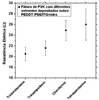 ![]() Figura 2. Resistência elétrica dos filmes de PVK com os diferentes solventes depositados sobre a estrutura PEDOT:PSS/ITO/vidro