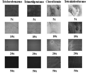![]() Figura 3. Imagens obtidas por microscopia óptica dos filmes de PVK dissolvidos em diferentes solventes orgânicos