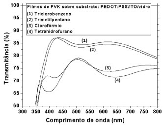 De acordo com as imagens obtidas dos diferentes filmes de PVK na Figura 3, verificamos maior uniformidade com a utilização do 1,2,4-triclorobenzeno e menor para o tetrahidrofurano, sendo que essa observação ficou mais evidente nas imagens com maior campo de visualização (ampliadas em 5 vezes). Estes resultados corroboram com aqueles encontrados na resistência elétrica (Figura 2) dos filmes de PVK, pois a maior uniformidade e menor resistência elétrica foram obtidas com os filmes utilizando-se 1,2,4-triclorobenzeno, enquanto que a menor uniformidade e maior resistência elétrica foram obtidas com os filmes utilizando-se tetrahidrofurano. A morfologia da superfície do filme de PVK formado é fortemente dependente da taxa de evaporação do solvente e as propriedades elétricas têm relação com a afinidade entre o solvente orgânico e o PVK. Nas análises de transmitância dos filmes de PVK, verificamos que estes apresentaram elevada transparência na faixa do comprimento de onda da luz visível, embora o ITO e o PEDOT:PSS (utilizados como substrato) não sejam completamente transparentes. A Figura 4 mostra os resultados de transmitância em função do comprimento de onda para os filmes de PVK depositados sobre PEDOT:PSS/ITO/vidro, para todos os solventes analisados.