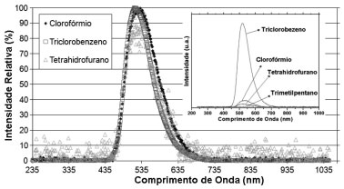 ![]() Figura 5. Intensidade espectral relativa da eletroluminescência obtida dos OLEDs montados com filmes de PVK diluído nos diferentes solventes. Nota: A relaçao sinal ruído da luminescência obtida para o dispositivo montado utilizando o solvente trimetilpentano é muito elevada e por esse motivo nao foi colocada no gráfico