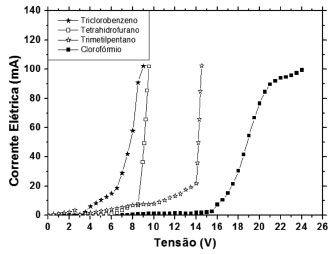 Na Figura 5, as curvas dos OLEDs foram normalizadas no gráfico maior, enquanto que no gráfico menor foram mantidas as curvas conforme obtidas diretamente do software do equipamento. Dessa forma, os dispositivos com triclorobenzeno acabaram apresentando um comportamento muito parecido com os dispositivos montados com clorofórmio, seguido pelo comportamento do dispositivo montado com tetrahidrofurano, sendo que este apresentou maior quantidade de ruído. Os dispositivos montados com trimetilpentano apresentaram o maior ruído de todos e, devido a este comportamento, não foi colocado no gráfico. Se analisarmos as curvas de emissão, sob o ponto de vista mais qualitativo que quantitativo, verificamos que o gráfico menor situado na Figura 5 apresenta um comportamento muito diferente, levando-se em conta o cuidado de utilizarmos a mesma metodologia para extração dos resultados, o que coloca todos os dispositivos na mesma condição. Originalmente, o eixo das ordenadas (eixo y) é dado pelo software do espectrorradiômetro (Luzchem Research Inc. Spectroradiometer, versão 3.3) como intensidade, que é apenas uma forma representativa (e não absoluta) para comparação das intensidades alcançadas por cada OLED testado. Ainda nesta Figura 5, na qual consta o gráfico menor, verificamos que o dispositivo obtido com o uso de 1,2,4-triclorobenzeno apresentou um pico de emissão mais definido e intenso em 518 nm, em comparação com os demais, o que corresponde à cor verde do espectro da luz visível. Para este pico de emissão, a tensão observada foi de ≈ 4,5 V e a corrente elétrica de aproximadamente 1 mA. Dispositivos obtidos com a utilização de clorofórmio e tetrahidrofurano apresentaram picos de emissão muito menos intensos, obtidos nas mesmas condições de polarização, em comparação ao 1,2,4-triclorobenzeno. Em relação ao trimetilpentano verificamos que o espectro apresentou a intensidade muito reduzida em comparação com os outros dispositivos, porém, ampliando-se o espectro foi possível visualizar a emissão de luz na faixa de 500 a 550 nm, o que também corresponde à emissão de cor verde. A mudança do solvente utilizado na formação da camada ativa não deslocou significativamente os picos de emissão dos dispositivos e essa variação observada em todos os espectros não alterou significativamente a emissão de cor verde dos OLEDs. É importante ressaltar que em outro estudo foi verificada a possibilidade da emissão de luz originar-se do Alq3 (utilizado como ETL), ao invés do PVK. Utilizando-se a mesma arquitetura, vidro/ITO/PEDOT:PSS/PVK/ETL/Al, onde a camada de Alq3 foi substituída por Butyl-PBD, constatou-se a eletroluminescência na cor azul.35 O fenômeno observado pode ser explicado pelo fato do PVK apresentar propriedades elétricas semicondutoras e contribuir na locomoção dos portadores do tipo buracos, levando ao incremento da recombinação de pares elétrons-buracos na camada injetora de elétrons (Alq3), o que pode ter propiciado a emissão da luz verde, ao invés da recombinação de pares elétrons-buracos ocorrer no interior da camada de PVK. Khalifa et al. montaram dispositivos com arquitetura vidro/ITO/PEDOT:PSS/PVK/Al, ou seja, sem a camada Alq3 (como ETL) e não reportaram a eletroluminescência dos dispositivos, isso pode indicar mais uma evidência de que a emissão pode ser proveniente da camada de Alq3.36 Para verificarmos o comportamento elétrico dos OLEDs montados com os diferentes filmes de PVK, os dispositivos foram polarizados nas mesmas condições. A Figura 6 mostra os resultados das curvas de corrente-tensão, obtidas para os diferentes dispositivos OLEDs montados.