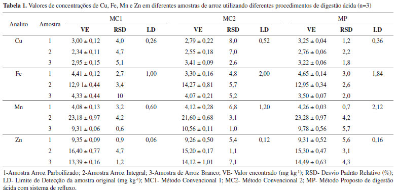 RESULTADOS E DISCUSSÃO Comparação entre os procedimentos de preparo das amostras Quando se faz uso de sistemas abertos de digestão, frequentemente, os métodos de preparo de amostras para análise de alimentos empregando técnicas espectrométricas utilizam misturas ácidas ou meios ácidos na presença de reagentes oxidantes para a sua completa digestão.16 Entretanto, recentemente, os sistemas de refluxo com dedo frio vêm apresentando grande aplicabilidade no preparo de amostras de diferentes matrizes, sejam elas orgânicas ou inorgânicas. O uso destes sistemas possibilita a condensação dos ácidos utilizados, o que evita a reposição destes durante a etapa de digestão, propiciando uma redução no consumo de reagentes e dispensando um controle minucioso da temperatura. Isso possibilita a operação em temperaturas mais elevadas, reduzindo o tempo de preparo e minimizando os riscos de contaminação, justificando a utilização destes sistemas no preparo de amostras para determinação de elementos como Cu, Fe, Mn e Zn.11-13,17 Conforme os resultados apresentados na Tabela 1, foi possível observar que o procedimento proposto baseado na digestão ácida com sistema de refluxo (procedimento 1), aplicado à análise de três diferentes amostras de arroz (parboilizado, integral e branco) para a determinação de Cu, Fe, Mn e Zn por FAAS, apresentou resultados satisfatórios em relação a sua exatidão, pois quando comparado com métodos convencionais de preparo das amostras as concentrações obtidas estão em concordância para os analitos em estudo, não apresentado diferenças significativas, como se verificou por meio do teste t-student pareado com 95% de confiança.