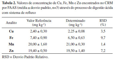 Com o mesmo objetivo de avaliar a exatidão do método proposto, a análise de uma amostra de material de referência certificado (farinha de arroz NIST 1568a) foi feita por FAAS e os respectivos analitos foram quantificados. Com base nos resultados apresentados na Tabela 2, pode-se verificar também que, os valores de concentração para Cu, Fe, Mn e Zn obtidos foram satisfatórios, com aproximadamente 95% de concordância entre os valores encontrados e os valores certificados.