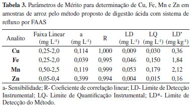 Cabe salientar que este método também mostrou ser simples, pois dispensa o uso do ácido perclórico ou misturas ácidas no preparo das amostras, conforme utilizados nos métodos convencionais de análise. Dessa forma, evita-se a necessidade de reposição do ácido durante o processo de digestão e minimizam-se os custos referentes à análise, bem como possíveis contaminações. É importante salientar também que o sistema utilizado é facilmente adaptado aos sistemas de digestão convencionais. Resultados analíticos De acordo com a FAO, o arroz, de uma forma em geral, é um cereal de extrema importância para o ser humano, sendo ele capaz de suprir as necessidades diárias de um adulto (20% de energia e 15% de proteína) e de se apresentar como fonte de vitaminas e minerais.3 No entanto, sabe-se que o conteúdo mineral do arroz pode ser fortemente influenciado pelas condições de cultivo, bem como aos diferentes tipos de processamento aos quais estes são submetidos.4,5 Com base nos resultados da Tabela 1, que apresenta as concentrações dos analitos em estudo (Cu, Fe, Mn e Zn), para as diferentes amostras de arroz analisadas (parboilizado, integral e branco) pode-se verificar que o teor dos nutrientes é realmente influenciado pelo processamento. Das amostras analisadas, observou-se que, de forma geral, o arroz integral foi o que apresentou maior quantidade de minerais, o que está em concordância com o esperado, sendo que os resultados para Cu não apresentaram diferenças significativas em relação a todas as amostras analisadas. No entanto, é importante salientar que no arroz integral, devido aos maiores teores de fibra e ácido fítico, não necessariamente esta maior concentração de Fe, Mn e Zn será absorvida pelo organismo, pois a biodisponibilidade destes elementos pode ser diretamente afetada pela natureza da matriz da amostra.18 Como os minerais apresentam-se normalmente em maiores concentrações nas camadas externas do grão, é esperado que, devido às etapas de processamento do arroz branco polido, ocorram perdas nos teores de nutrientes. Porém, de acordo com os resultados apresentados na Tabela 1, os valores encontrados para Mn e Zn na amostra de arroz parboilizado apresentaram concentrações menores quando comparado à amostra de arroz branco polido, o que de acordo com Storck e Heinemann et al.19,4 pode estar relacionado aos diferentes padrões de migração durante o processo de parboilização, que é característico a cada elemento, o que vem a justificar as diferentes concentrações encontradas nos grãos analisados. Parâmetros de mérito Os parâmetros de mérito obtidos para as curvas de calibração para Cu, Fe, Mn e Zn por FAAS, a partir do método proposto de preparo das amostras por digestão ácida com sistema de refluxo (procedimento 1), estão apresentados na Tabela 3. Como podem ser observados, os valores do coeficiente de correlação (R) foram superiores a 0,99, atestando a boa linearidade do método, referente à faixa linear específica para cada analito.