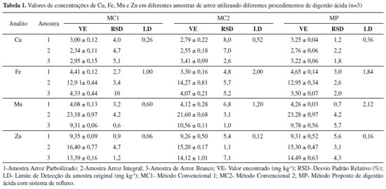 Reagentes e soluções Todos os reagentes utilizados foram de grau analítico. A água utilizada no preparo das amostras e das soluções foi obtida por um sistema de purificação de água Direct-Q 3 (Millipore Corporation, Bedford, MA, E.U.A.), com resistividade de 18,2 MΩ cm. Para o preparo das amostras foi utilizado Ácido perclórico (Vetec, Rio de Janeiro, Brasil) e Ácido nítrico 65 % (m/m) (Synth, Brasil), o qual foi purificado a partir de um sistema de destilação de subebulição de quartzo MA-075 (Marconi, Piracicaba, SP, Brasil). Soluções padrão de Cu, Fe, Mn e Zn foram diariamente preparadas a partir da diluição de soluções estoques contendo 1000 mg L-1 (Fluka, Buchs, Alemanha) de cada elemento em água deionizada. As curvas de calibração foram construídas a partir desses padrões em concentrações que variaram entre 0,5 e 2,5 mg L-1 para Mn, 0,05 e 0,4 mg L-1 para Zn, 0,25 e 2,0 mg L-1 para Cu e Fe. Os frascos de polipropileno (PP), materiais de vidro e os tubos do bloco digestor foram lavados primeiramente com água de torneira, seguidos de imersão em uma solução de HNO3 10% (v/v) por pelo menos 48 h, sendo posteriormente lavados com água deionizada e secos, sendo que os materiais de vidro foram secos em estufa. Para obter uma melhor eficiência de descontaminação, antes de passar pelo banho de HNO3, os tubos do bloco digestor também passaram por um banho de KOH 10% (v/v). Preparo das amostras As amostras de arroz branco, parboilizado e integral utilizadas foram adquiridas no comércio local da cidade de Pelotas, RS. Inicialmente, cerca de 20 g das amostras foram diretamente pesadas em um frasco de vidro e levadas até uma estufa, onde foram secas a uma temperatura em torno de 60 ºC por 48 horas. Após esta etapa permaneceram em um dessecador até atingirem temperatura ambiente para posterior pesagem. Dando continuidade ao procedimento, as amostras foram submetidas a um processo de trituração até que o grão adquirisse a forma de um pó homogêneo. Posteriormente, estas foram colocadas em frascos de polipropileno (PP) previamente calibrados e acondicionadas em dessecador até o momento da análise. As amostras comerciais (arroz parboilizado, branco e integral) foram tratadas a partir de três diferentes procedimentos de preparo para determinação de Cu, Fe, Mn e Zn, os quais serão descritos abaixo. Os procedimentos 2 e 3 foram utilizados para verificar a exatidão do método proposto por meio da comparação dos resultados obtidos. Para verificar também a exatidão do método proposto, o CRM citado anteriormente foi preparado somente pela digestão ácida com sistema de refluxo. Procedimento 1 - Digestão ácida com sistema de refluxo Para o desenvolvimento do método de preparo de amostra por digestão ácida com sistema de refluxo, aproximadamente 0,50 g de cada amostra de arroz foi pesada diretamente nos tubos de digestão, seguido da adição de 5,0 mL de HNO3 e levados para o bloco digestor. A seguir, o sistema de refluxo foi acoplado aos tubos de digestão e submetido ao aquecimento imediato no bloco digestor com temperatura de 210 ºC por um período de 3 h. Após o resfriamento, as amostras foram transferidas de forma quantitativa para os frascos de polipropileno e avolumadas a 20,0 mL com água deionizada. Procedimento 2 - Método convencional 1 Amostras de arroz foram digeridas segundo o método descrito por Tedesco et al.14 Para este procedimento foi pesado aproximadamente 1,0 g de amostra, diretamente nos tubos de digestão, onde foram adicionados 6,0 mL de HNO3 e deixados em repouso durante a noite. Após este período, essa solução foi levada a aquecimento em bloco digestor por 30 min a 85 ºC. Posteriormente, a temperatura foi elevada a 120 ºC e mantida até restar 1 mL de solução da amostra. Essa solução foi resfriada até temperatura ambiente e a ela foi adicionado 1,0 mL de HClO4, sendo esta aquecida à temperatura do bloco digestor de 185 ºC. Ao atingir a estabilização da temperatura e ocorrer o desprendimento dos gases, foi adicionado um funil na saída dos tubos, evitando-se desta forma a secura total da amostra devido a possíveis perdas de ácido por volatilização. Essa temperatura foi mantida por 2 h, sendo a solução resfriada à temperatura ambiente e posteriormente transferida para frascos de polipropileno, os quais foram avolumados a 20 mL com água deionizada. Procedimento 3 - Método convencional 2 Amostras de arroz foram digeridas segundo o método descrito por Malavolta et al.15 Para o método convencional 2, foi pesado aproximadamente 0,50 g de amostra diretamente nos tubos de digestão e foi adicionado uma mistura de 4,0 mL de HNO3 com 2,0 mL de HClO4, totalizando um volume ácido de 6,0 mL. Essa solução foi levada a aquecimento, com um aumento gradativo da temperatura até chegar a 160 ºC no bloco digestor, e mantida até o volume se reduzir a metade. Depois a temperatura do bloco digestor foi elevada a 210 ºC e mantida até que o extrato ficasse incolor, o que necessitou de aproximadamente 20 min de aquecimento. Essa solução foi resfriada e transferida para frascos de polipropileno e avolumadas a 20,0 mL com água deionizada. Metodologia Primeiramente, os estudos foram realizados com o objetivo de verificar possíveis erros de pesagem, eliminando a umidade da amostra, conforme descrito no item de preparo das amostras. Por meio deste estudo foi possível calcular também o teor de umidade referente a cada amostra de arroz analisada. A fim de avaliar a possibilidade da construção das curvas analíticas em meio aquoso, para os diferentes elementos determinados, um estudo adicional de calibração comparando-se a inclinação das curvas foi realizado. Visto que as curvas obtidas, tanto em meio aquoso como nos demais meios de preparo, não apresentaram diferenças significativas, as análises foram feitas a partir da preparação das curvas de calibração em soluções aquosas. Como descrito a