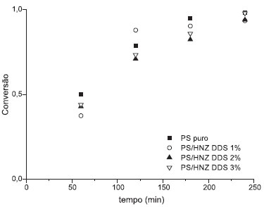 ![]() Figura 1. Comparaçao entre os resultados obtidos na conversao do polímero puro e dos nanocompósitos PS HNZ/DDS