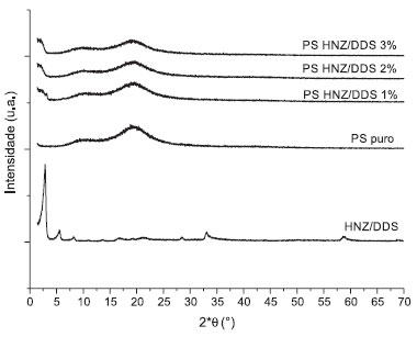 ![]() Figura 2. Difratogramas do HNZ/DDS, PS puro e dos nanocompósitos PS HNZ/DDS