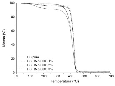 ![]() Figura 3. Termogramas do PS puro e dos nanocompósitos PS HNZ/DDS