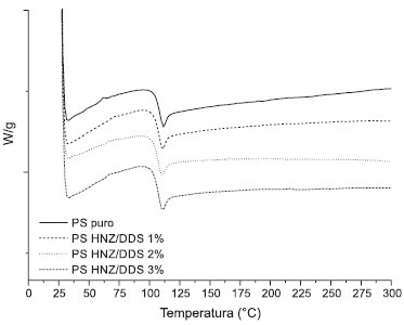 ![]() Figura 4. Curvas de DSC do PS puro e dos nanocompósitos PS HNZ/DDS