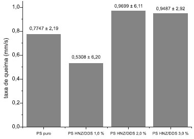 Os resultados obtidos com o teste de inflamabilidade mostram que os nanocompósitos com 1,0% de agente de reforço queimam menos que o poliestireno puro, enquanto que os nanocompósitos com 2,0 e 3,0% de agente de reforço queimam mais que o poliestireno puro. Observa-se na Figura 5 que o poliestireno puro apresenta grau de queima de aproximadamente 0,8 mm/s, enquanto que os nanocompósitos PS HNZ/DDS 1,0% apresentaram grau de queima de aproximadamente 0,5 mm/s, apresentando efeito de barreira. Já os nanocompósitos PS HNZ/DDS 2,0 e 3,0% apresentaram grau de queima superior ao do poliestireno (na faixa de 0,95 mm/s), indicando um efeito catalisador na queima, ou seja, acelera o processo de queima do material.20