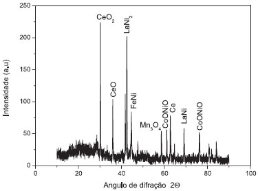 As rachaduras ocorreram durante a remoção do material ativo devido ao processo de intercalação e desintercalação de átomos de hidrogênio (isto é, de carga e descarga, respectivamente, do ânodo). Na Figura 3 observa-se o difratograma de raios X do eletrodo negativo. Os sinais foram comparados com os cartões JCPDS identificando os compostos CeO2,21 CeO,22 Ce,23 LaNi5,24 LaNi,25 FeNi,26 Mn3O427 e CoONiO.28