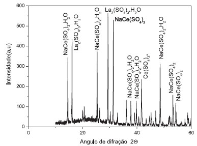 A concentração relativa do material do ânodo foi determinada por análise de ICP-OES e apresentou as seguintes concentrações: Co = 302 ppm, Ni = 190.0 ppm, Ce = 138.8 ppm, Fe = 84.1 ppm, La = 22.1 ppm, Mn = 18.9 ppm, Zn = 1.1 ppm. Os resultados indicam altas concentrações de Co, Ni e Ce no qual é substituído pelo La em muitas ligas. O Fe detectado é, devido à contaminação com o coletor de corrente, Mn e traços de Zn são provenientes do eletrodo positivo. Os resultados de ICP-OES concordaram muito bem com as medições de difração de raios X. Caracterização dos compostos de terras raras recuperados A composição e a concentração relativa dos elementos químicos que compõem os materiais de terras raras foram Ce = 24.67 ppm, La = 6.256 ppm, Mn = 0.089 ppm, Zn = não detectado, Ni = não detectado, Co = não detectado e Fe = não detectado. A análise de ICP-OES confirmou que os elementos cobalto, níquel e ferro permaneceram na solução após a precipitação de cério e lantânio e que existe uma baixa concentração de manganês no material recuperado. Os compostos de terras raras são recuperados com elevada pureza e podem ser usados em aplicações industriais. A Figura 4 mostra o difratograma de raios X para os materiais recuperados. De acordo com os arquivos JPCDS, os materiais recuperados são compostos por NaCe(SO4)2.H2O,29 NaCe(SO4)2,30 Ce2(SO4)3,31 NaCe(SO4)232 e La2(SO4)3.H2O.33 Estes resultados estão de acordo com a solução de dissolução do ânodo analisado por ICP-OES.