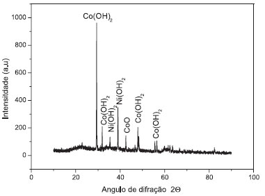 Caracterização do cobalto e níquel recuperados O difratograma de raios - X dos compostos Co e Ni são mostrados na Figura 6. Este difratograma apresenta picos que, quando comparados com a base de dados JCPDS, indicam um empacotamento hexagonal de β-Ni(OH)234 e Co(OH)2,35 com os parâmetros a = 3,13 Å e c = 4,61 Å. A estrutura cúbica para o CoO 36 apresenta parâmetro de rede a = 4,29 Å.
