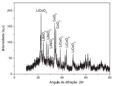 No espectro de FT-IR, os números de onda de 3644 cm-1 e 3464 cm-1 indicam a vibração dos grupos hidroxilas do Ni(OH)2 e Co(OH)2 e o alongamento vibracional do grupo hidroxila da água adsorvida, respectivamente. Sinais de FT-IR de 1384 cm-1 são característicos de sulfatos e carbonatos. Estes resultados confirmam que o hidróxido de níquel e cobalto retém sólidos de sulfato e carbonato a partir das soluções iniciais. Além disso, a banda de absorção em 546 cm-1 é atribuível ao alongamento vibracional da ligação Co-O. O alongamento vibracional do Ni-O pode ser observado nas regiões de 637 cm-1 e 835 cm-1. Os hidróxidos de cobalto e níquel recuperados foram posteriormente utilizados para sintetizar materiais de cátodos para baterias de íon - lítio. Caracterização dos materiais sintetizados para baterias de íon - lítio Na Figura 7 observa-se o difratograma de raios X dos materiais sintetizados. Os picos dos difratogramas foram comparados com os arquivos JPCDS para confirmar que os materiais recuperados são compostos de LiCoO2,37 LiNiO238 e CoO.
