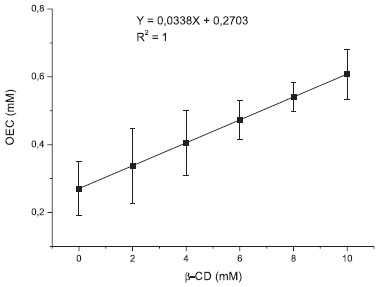 A estequiometria do complexo OEC:β-CD foi estimada pela técnica de solubilidade de fases, a partir da relação linear obtida entre a quantidade de OEC solubilizado e a concentração de β-CD das soluções (Figura 5),28 sugerindo a formação de complexo de primeira ordem relativamente a CD e de ordem 1 ou maior que 1 para o OEC, ou seja, o aumento da solubilidade do OEC é proporcional ao incremento das concentrações da CD, característico de uma estequiometria 1:1 ou superior, por exemplo, 2:1.12